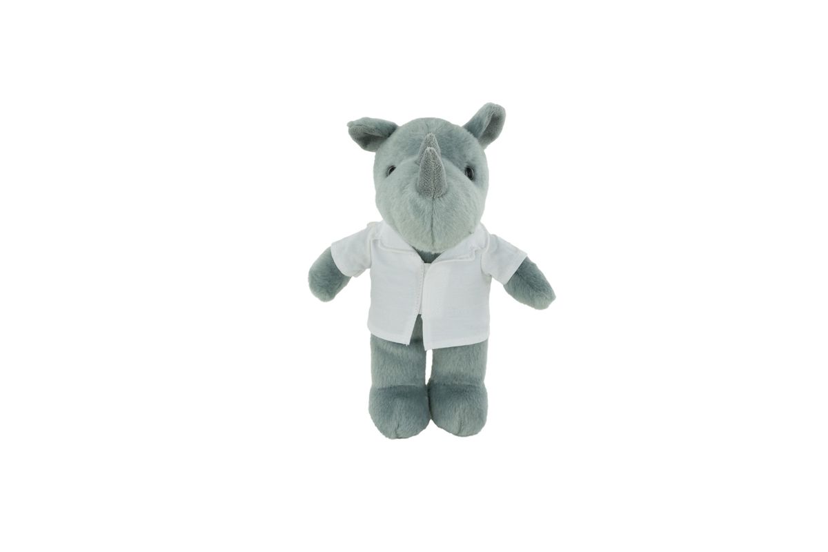 This stuffed animal selection is an excellent way to get their attention! The Soft Plush Rhino w/Horns in a beautiful Gray fur, will be wearing a customized White Doctor Jacket to help them reach their marketing & advertising goals. Available in an 8" size as the perfect super soft cotton-polyester blended promotional pick, which also has up to a four-color imprint of any name or logo they choose to highlight. Reach target audiences at trade shows, conferences, local sporting events, schools, School Mascot, Graduations, local organizational meetings, or your Client’s next Special Occasion !