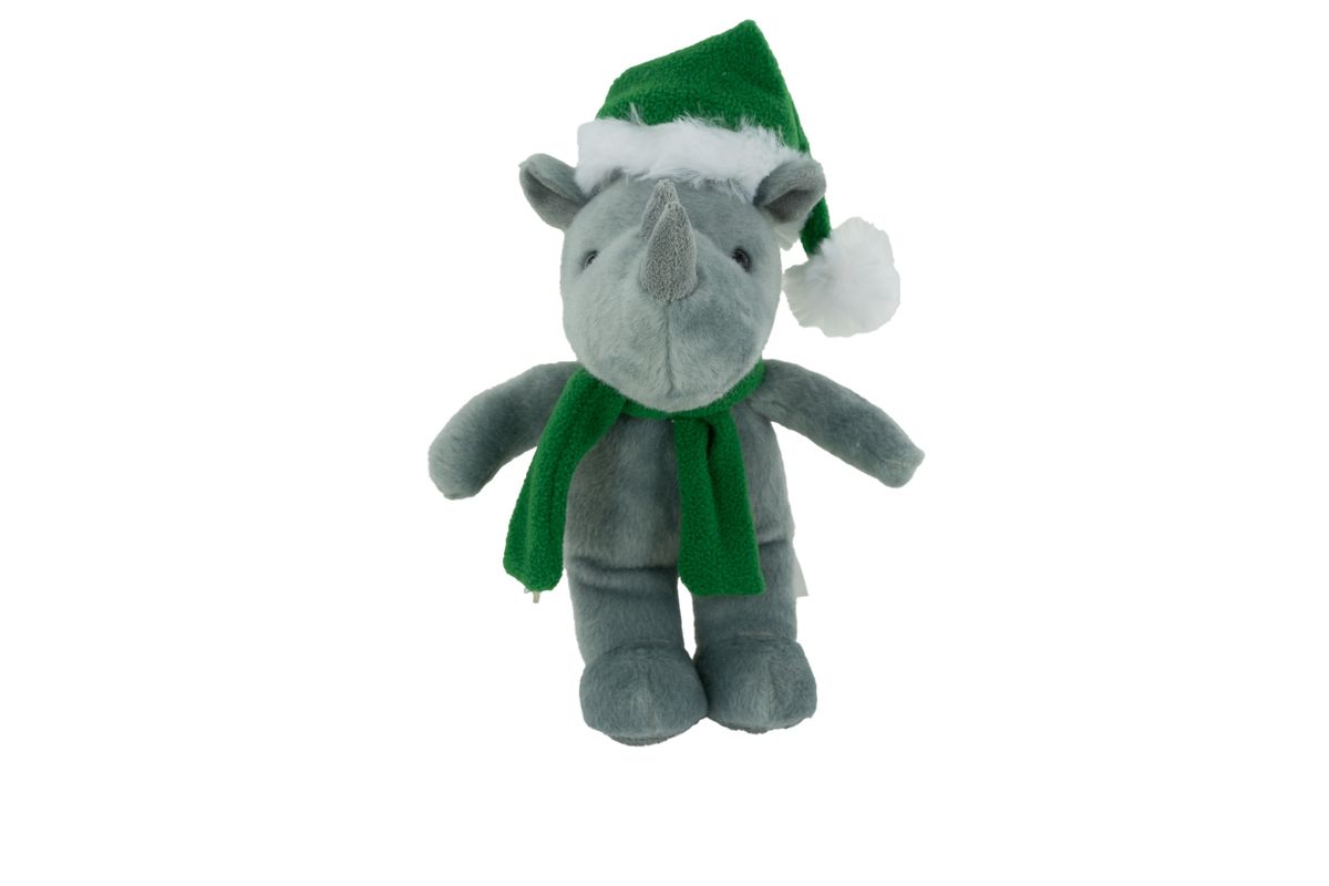This stuffed animal selection is an excellent way to get their attention! The Soft Plush Rhino w/Horns in a beautiful Gray fur, will be wearing a customized Christmas Hat & Scarf help them reach their marketing & advertising goals. Available in an 8" size as the perfect super soft cotton-polyester blended promotional pick, which also has up to a four-color imprint of any name or logo they choose to highlight. Reach target audiences at trade shows, conferences, local sporting events, schools, School Mascot, Graduations, local organizational meetings, or your Client’s next Special Occasion !